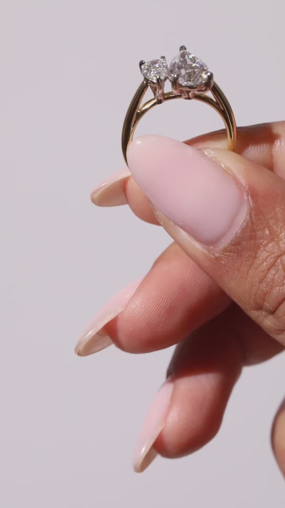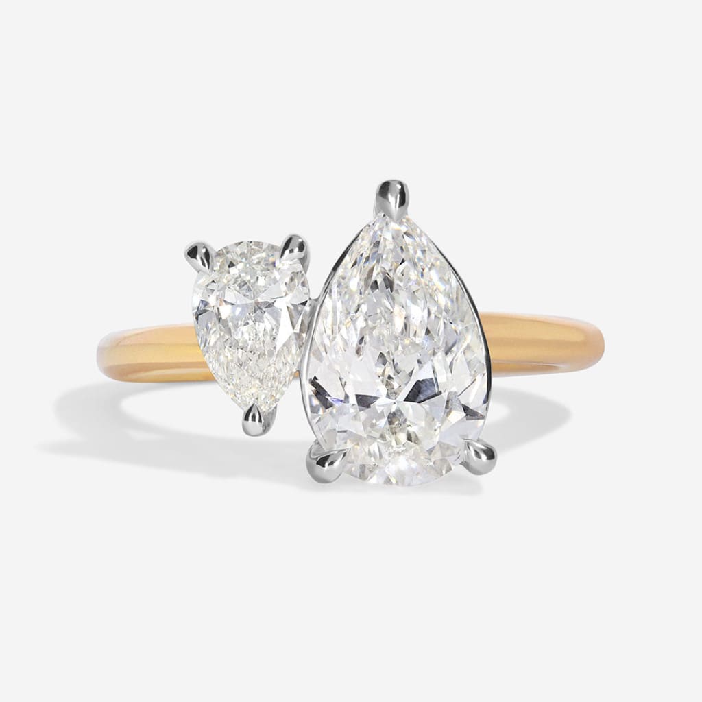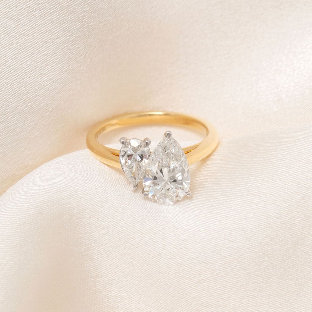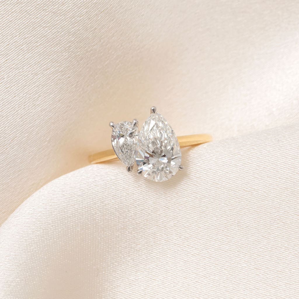 Two pear-cut lab-diamonds form a contemporary take on the Toi et Moi design. Together totalling 2.50ct, the pairing features one larger colourless diamond and a complementary, smaller counterpart. Their opposing orientations and faceting patterns introduce a dynamic