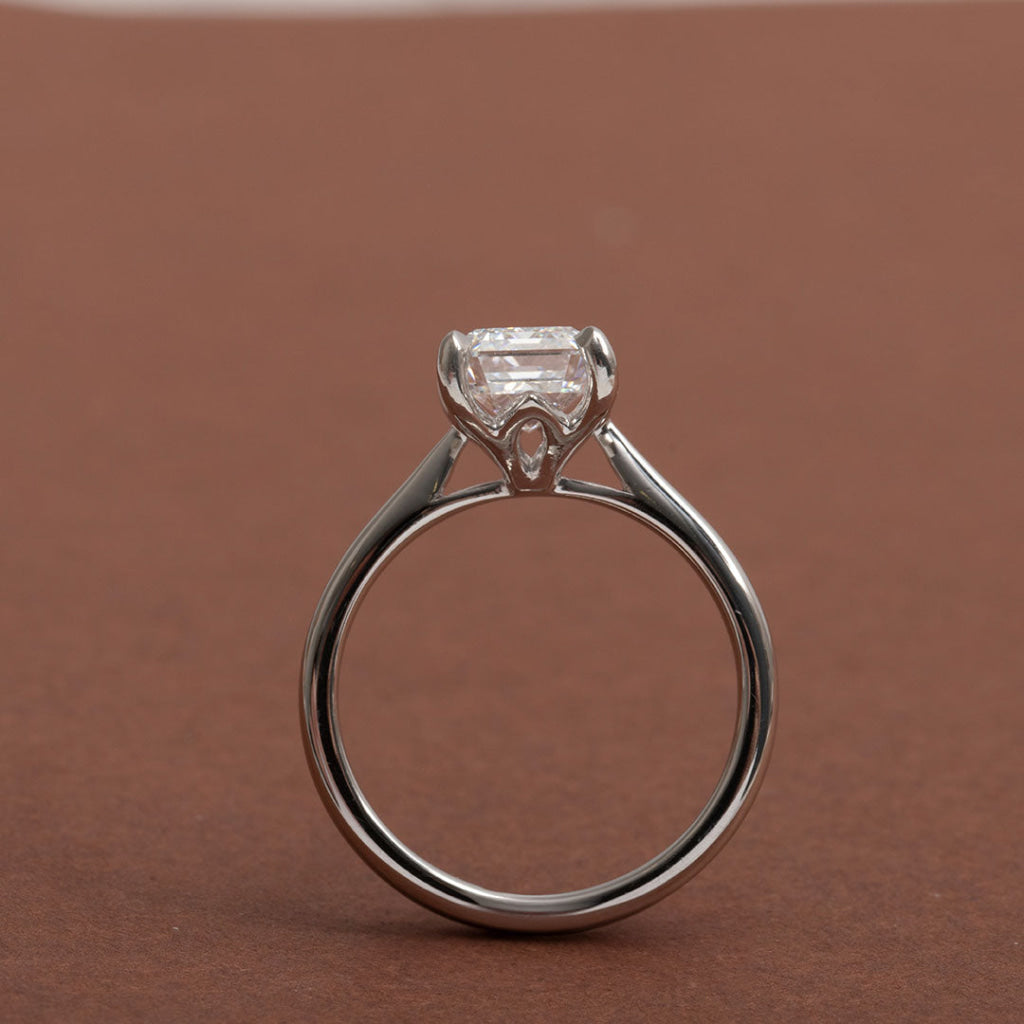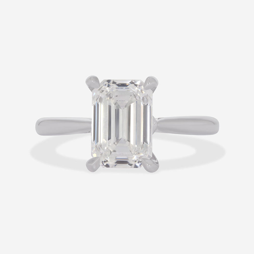 An emerald-cut lab-grown diamond with architectural precision and exceptional clarity. At 2.50ct, the colourless VS clarity stone displays the characteristic step-cut faceting that creates long, clean reflections highlighting the diamond's remarkable