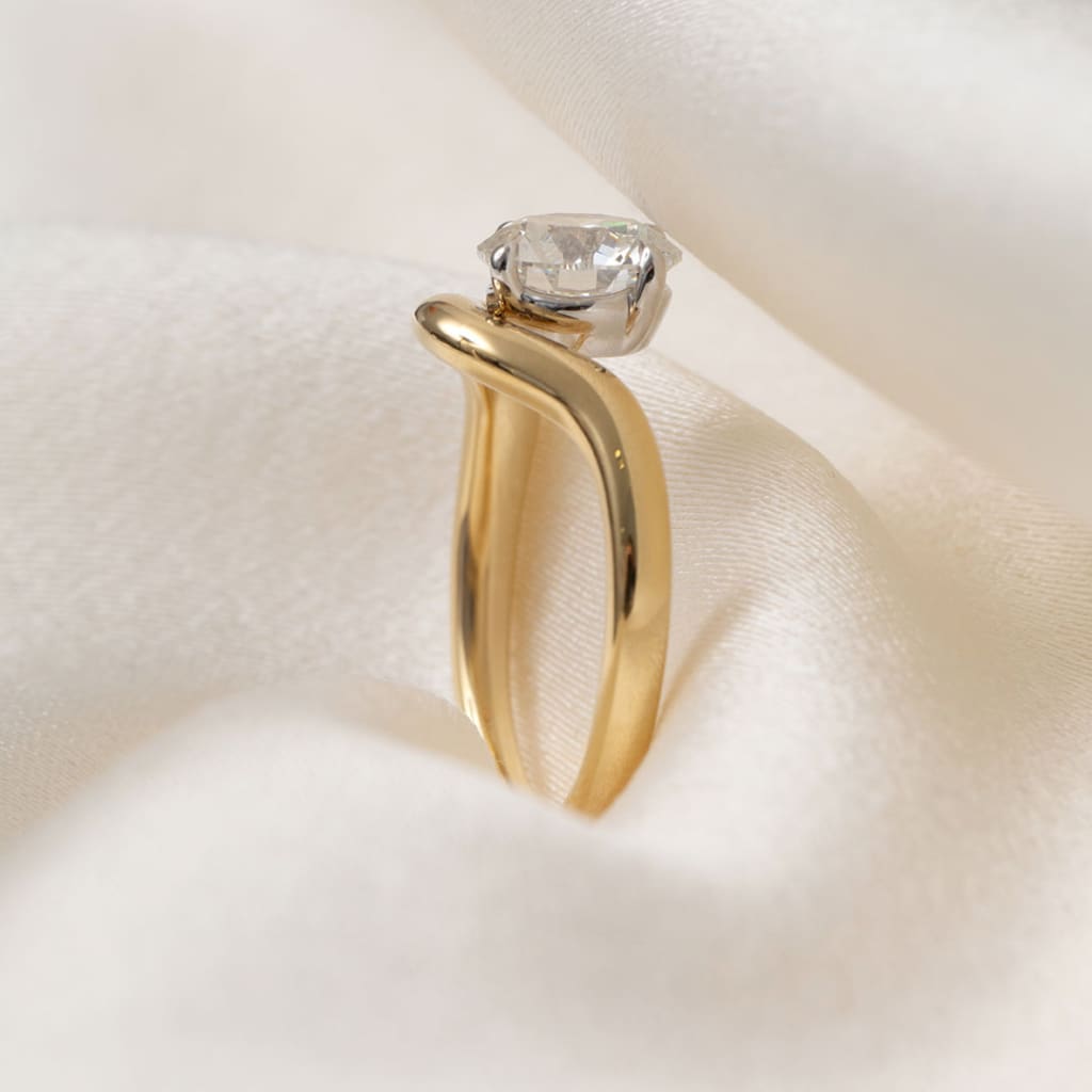 The elegant band flows gracefully around the diamond, creating a modern wave-like design that draws attention to the diamond's exceptional sparkle.
