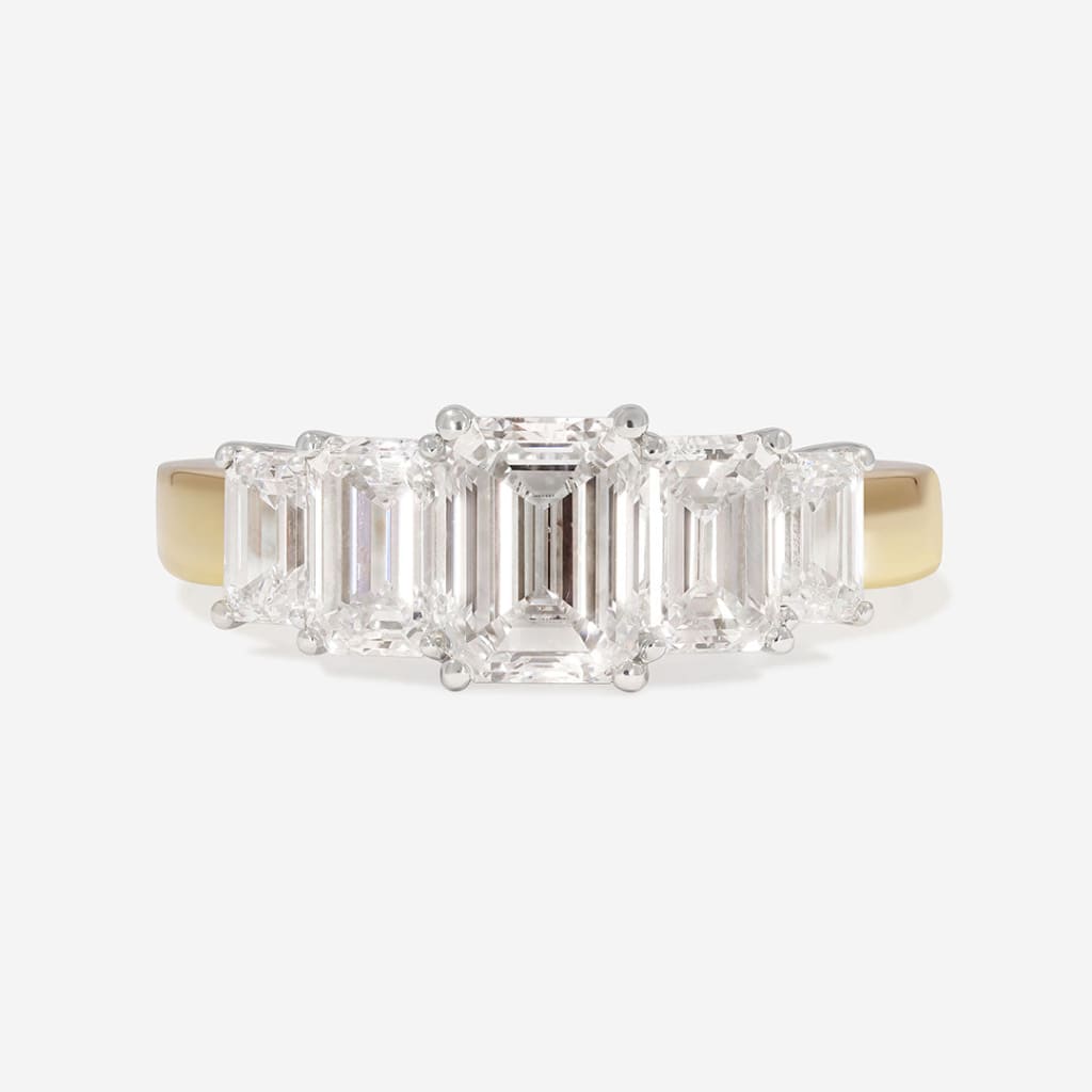 A strong architectural silhouette defines this design, where a quintet of emerald cut lab diamonds offers symmetry and precision. With a combined 2.50ct weight, these colourless diamonds showcase stepped facets and crisp geometry that reflect light with refined clarity.